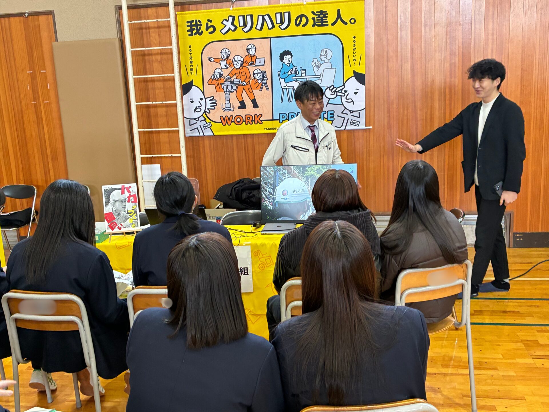 武江組が建設業として地域の暮らしを支える重要な役割を担っていることや、10代から70代まで幅広い世代が活躍している職場環境などについて直接お伝えすることができました。高校生の皆さんには、この合同企業説明会を通してご自身の進路を考えるきっかけとしていただけたら嬉しいです。